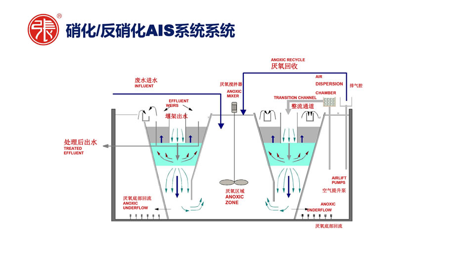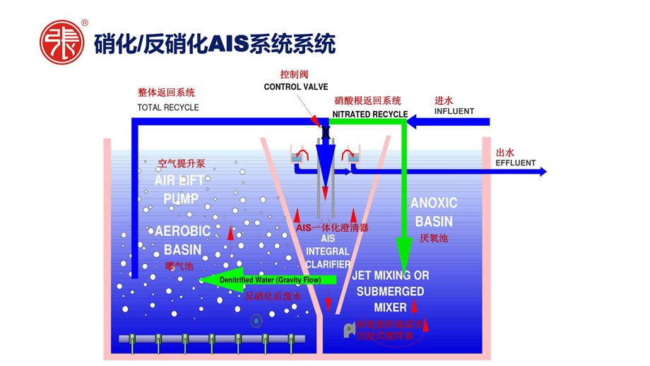 AIS系统是一个经济实用的污水处理系统,没有移动设施(淤泥回收泵系统,搅拌器,刮除机等),将澄清器和曝气池整合在一起的一体化处理设施。
